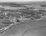 East Deering and Baxter Boulevard from southwest. Washington Avenue at horizontal center. Presumpscot School (19 Presumpscot Street) at center left. Martin's Point and Mackworth Island in right background. Falmouth in background left.